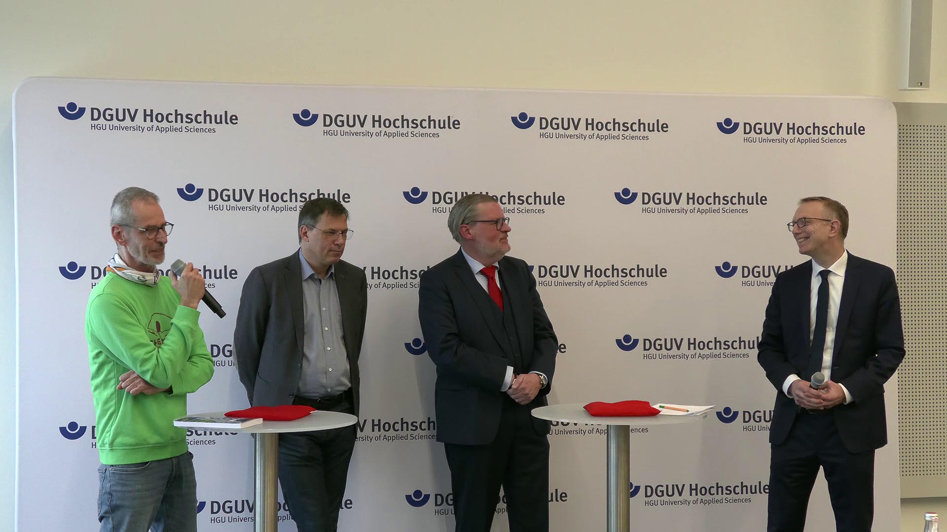 Abschlussdiskussion mit Prof. Dr. jur. Laurenz Mülheims (Professur Recht/Sozialrecht, Hochschule Bonn-Rhein-Sieg), Ass. jur. Martin Forchert (Verwaltungsdirektor, Berufsgenossenschaft Holz und Metall), Dr. jur. Oliver Schur (Richter am Landessozialgericht Niedersachsen-Bremen und Vorsitzender der Kommission SGB VII des Deutschen Sozialgerichtstages e. V.) und Prof. Dr. iur. Eric Zimmermann (Professur für Sozialrecht, DGUV Hochschule)